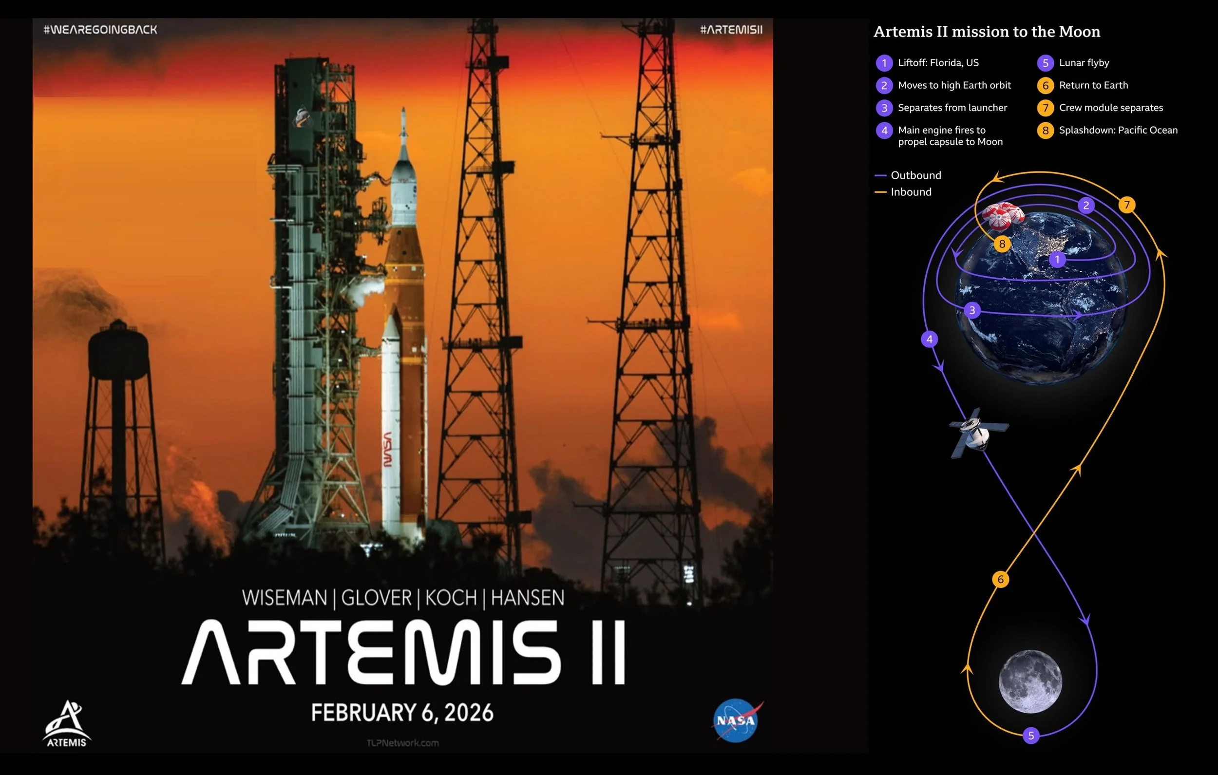 Artemis II is scheduled to lift-off at the Kennedy Space Center in Florida on February 6th; sending four astronauts on a journey around the Moon to test Orion's systems and life support, but not landing. Launch timing details are given below. However, the probability of this timeline depends on technical issues and the weather. I would estimate the likelihood to be 50% to 70% for a launch at this date and time. However there are fairly frequent launch windows for lunar orbit, so potential weather delays are usually only for days or weeks.